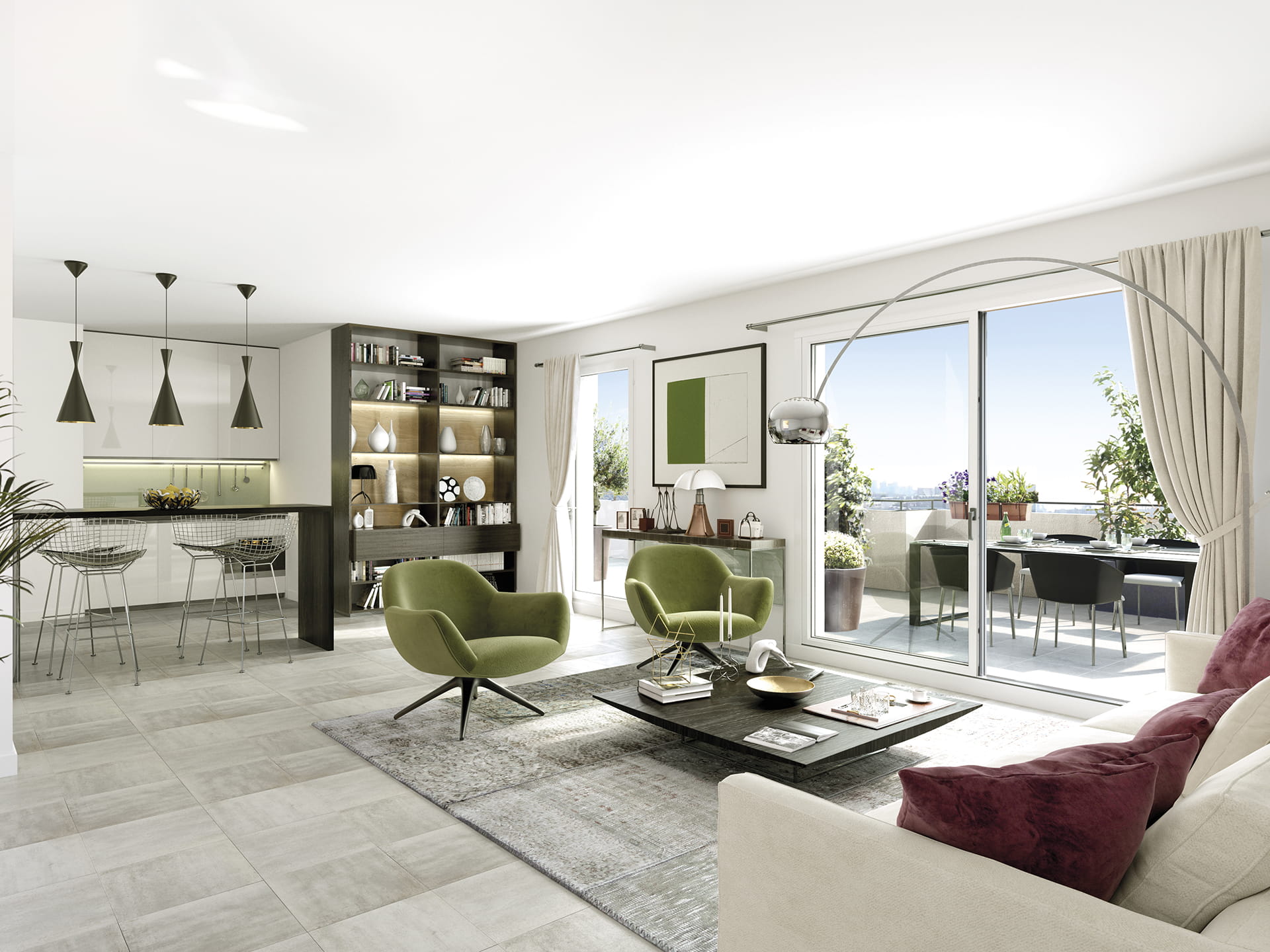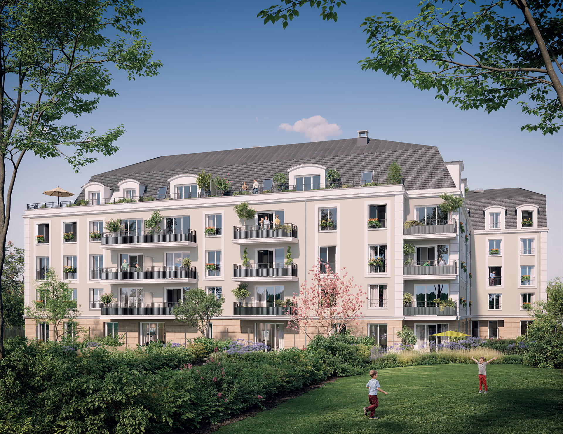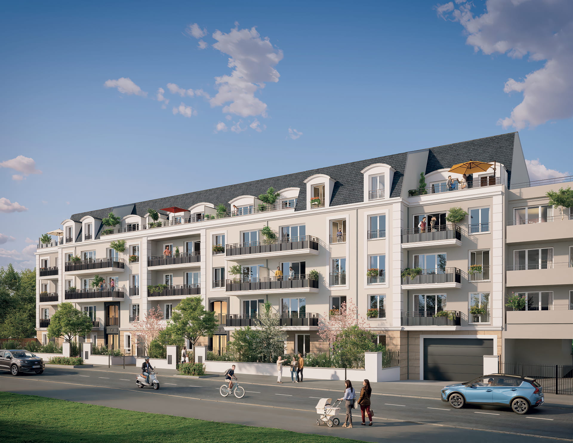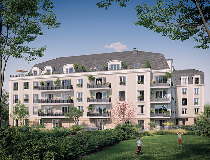 La résidence dévoile une architecture élégante, inspirée des codes classiques revisités dans une écriture contemporaine. Les façades rythmées, balcons et retraits animent la silhouette, tandis que la pierre en soubassement, les enduits clairs, les garde‑corps en serrurerie et les toitures Mansart en ardoise et zinc signent une composition intemporelle et raffinée.