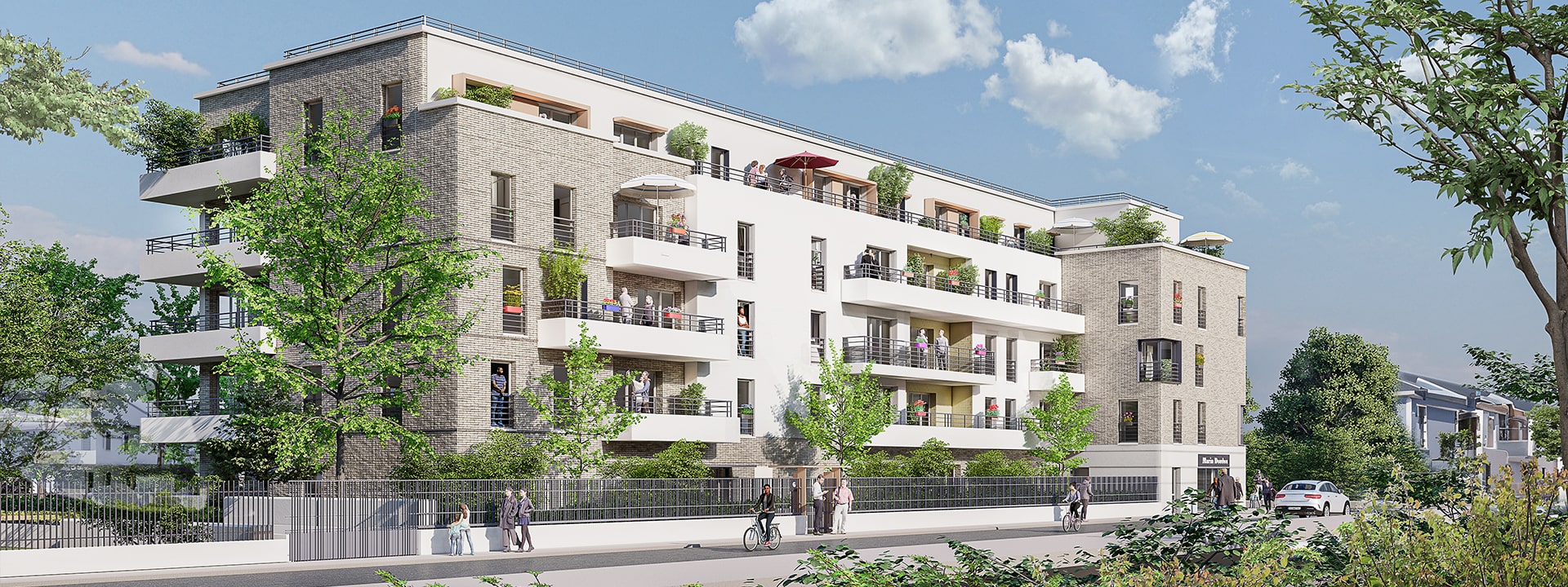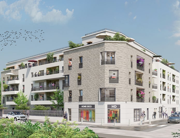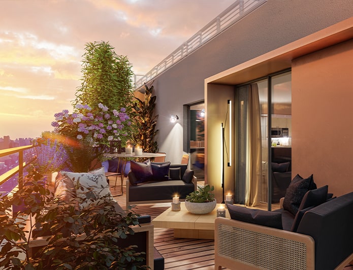 "Les Terrasses Lumière" dessinent un angle autour d’un jardin paysager, propice à la qualité de vie. Ses façades de trois étages surmontées d’un attique forment une partition de belle allure où se profilent les lignes horizontales des balcons et la générosité des ouvertures.